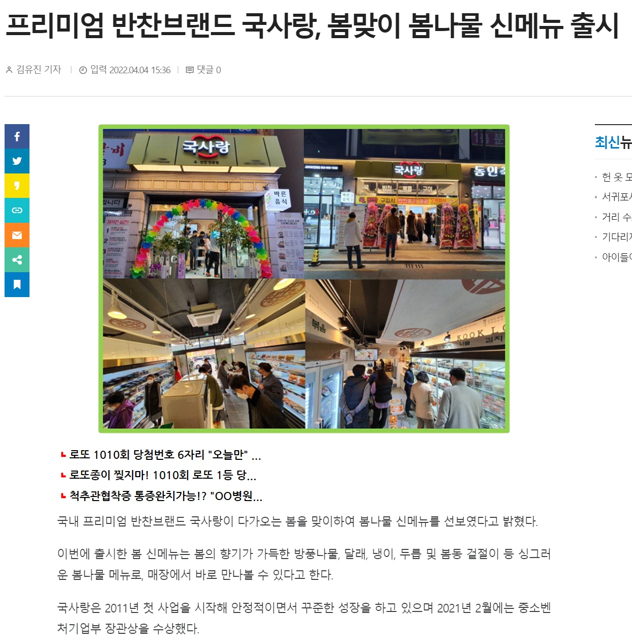 | 제목 | 프리미엄 반찬브랜드 국사랑, 봄맞이 봄나물 신메뉴 출시 | ||||