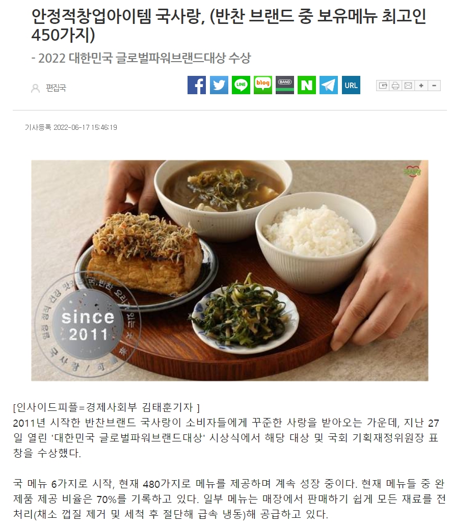 | 제목 | 안정적창업아이템 국사랑, (반찬 브랜드 중 보유메뉴 최고인 450가지)- 2022 대한민국 글로벌파워브랜드대상 수상 | ||||